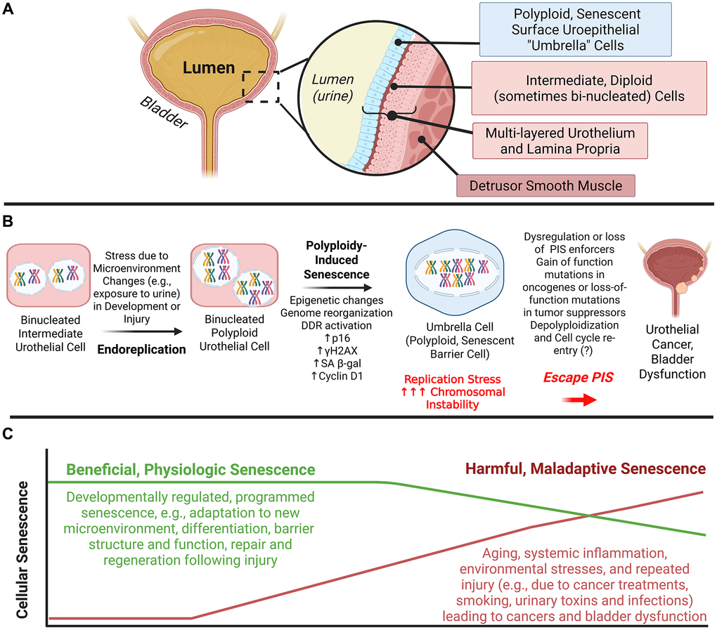 The idea that cancers can arise from cells escaping senescence is well established [10], but our observations link this specifically to polyploidization. This has important implications in the context of therapy-induced senescence (TIS). Many cancer treatments trigger senescence through replication stress and polyploidization [11]. While initially growth-arrested, these polyploid cancer cells can adapt, escape, and drive relapse, and caution has been proposed with the use of drugs that cause cancer cells to become polyploid and resistant to treatment [6]. By contrast, naturally occurring polyploid senescent cells, such as bladder umbrella cells, appear to serve important biological functions—though they too may destabilize under chronic stress. For example, smoking, the leading risk factor for bladder cancer, introduces urinary toxins such as acrolein that increase oxidative stress and DNA damage. Such insults may erode the PIS arrest in umbrella cells, enabling their re-entry into the cell cycle, mutagenesis, and malignant transformation.