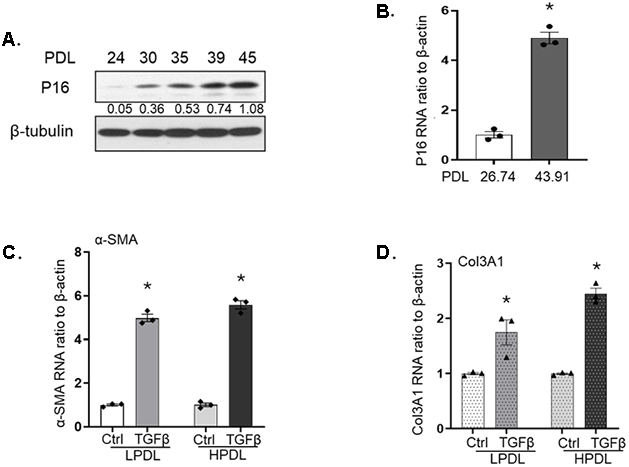 TGF-β1 is a well-known profibrotic cytokine in fibrotic related diseases, including pulmonary fibrosis [9]. We and others have reported increased profibrotic genes, like α-smooth muscle actin (α-SMA), collagen 3A1 (Col3A1) in response to TGF-β1 [24, 25]. Due to the significantly different phenotypes of the young and senescent cells [26], we examined if there are differences in gene expression in response to TGF-β1 in IMR90 cells of LPDL and HPDL. Despite the higher baseline expression of the HPDL cells of the two genes (Supplementary Figure 1), our data showed that both LPDL and HPDL cells have similar patterns of up-regulated α-SMA after 24 hours of TGF-β1 treatment (Figure 1C). Col3A1 is reported to be increased in hyperoxia-induced senescent lung fibroblasts [27], in our model of replicative induced senescence, the Col3A1 RNA expression showed similar upregulation as α-SMA (Figure 1D). Overall, although the young LPDL and near senescent/senescent HPDL fibroblasts are phenotypically different, their response to TGF-β1 induced up-regulation of profibrotic genes α-SMA and Col3A1 are similar.