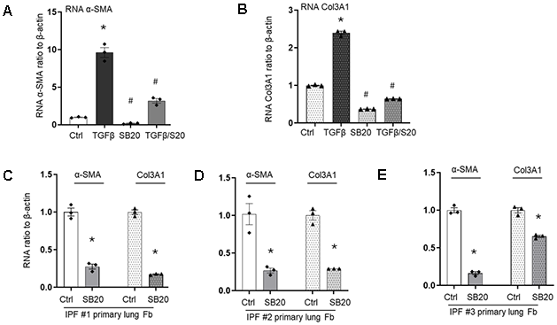 Next, we examined the transcription level changes of α-SMA and Col3A1 in the myofibroblasts either by TGF-β1 treated IMR90 or in primary IPF cells with p-38 MPAK inhibition. We measured the RNA expression levels of α-SMA and Col3A1at 24 hours after TGF-β1 treatment with or without p-38 MAPK inhibition as the same conditions shown in Figure 3C. The up-regulated α-SMA (Figure 4A) and Col3A1 (Figure 4B) by TGF-β1 are significantly reduced by p-38 MAPK inhibition. In addition, adding SB202190 alone also significantly reduced the transcription level of α-SMA and Col3A1 (Figure 4A, 4B).
