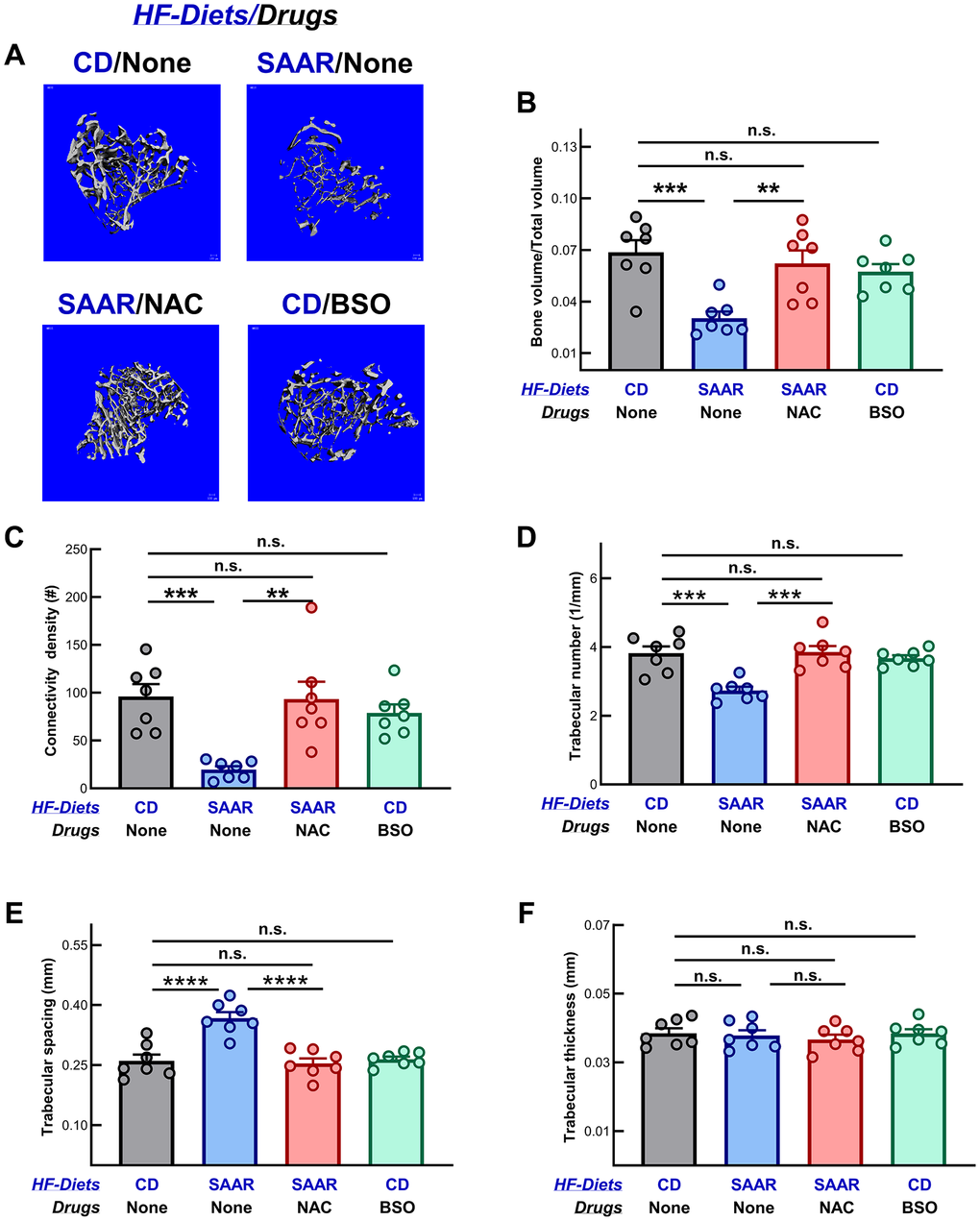 Two factors determine bone strength: bone mineral content (also known as bone mineral density) and bone microarchitecture, which refers to the physical arrangement of the material in cortical bone and the arrangement and density of the trabecular struts (rods and plates) at the microscopic level. Mice on the SAAR diet had less trabecular bone than those on the CD diet (Figure 1A). Several measures of trabecular bone, including the ratio of bone volume to total volume (BV/TV, Figure 1B, 44% of CD, P < 0.001), connectivity density (Figure 1C, 20% of CD, P < 0.001), and trabecular number (Figure 1D, 71% of CD, P < 0.001) were lower in the SAAR mice. Trabecular space, which is inversely associated with trabecular number, was higher in the SAAR mice (Figure 1E, 141% of CD, P < 0.0001). NAC reversed all these indicators to the levels observed in the CD mice; importantly, BSO had no effect. Trabecular thickness was similar in all groups (Figure 1F).