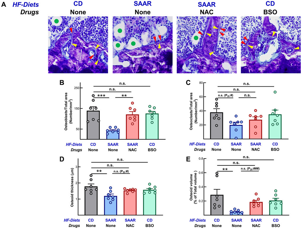 The changes induced by the SAAR diet and NAC in osteoid thickness paralleled the changes they caused in osteoblast abundance (Figure 3D). In SAAR mice, the osteoid thickness was 66% of that in the CD mice (P = 0.003), while in the NAC mice, it was 85% (Figure 3D). In CD mice, the prominent seam of osteoid (light blue staining, yellow arrowheads in Figure 3A) secreted onto the bone surfaces indicates that osteoblasts are active. A strikingly different picture is seen from the bones of the SAAR-fed mice. Few osteoblasts and little osteoid is seen on bone surfaces, especially when marrow adipocytes (green circles) are close to bone surfaces. In contrast, similar to those in the CD mice, NAC mice had a higher number of osteoblasts and more osteoid on bone surfaces. These changes indicate that NAC corrected the loss of osteoblasts and osteoid volume caused by SAAR (Figure 3A, 3B, 3E). Histologically, the BSO mice were not different from the CD mice.