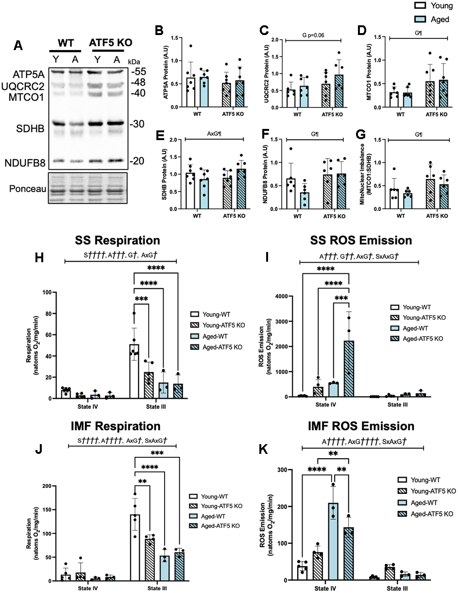 The greater fatiguability observed in aged ATF5 KO mice prompted us to investigate whole muscle mitochondrial content and the function of mitochondrial subpopulations. Consistent with prior evidence [24], ATF5 KO animals displayed an elevation in mitochondrial content, as assessed via a Total OXPHOS blot. The expression of UQCRC2, NDUFB8, and SDHB was ~1.5-fold greater in ATF5 KO mice, regardless of age (Figure 5C–5F, P=0.06, P<0.05). However, no changes were observed for the expression of PGC-1α, a main regulator of mitochondrial biogenesis, nor were there any evident changes in the levels of mitochondrial dynamics regulators such as Opa1 and DRP1 (Supplementary Figure 2A–2D). The ratio of MTCO1:SDHB, an indicator of mitonuclear imbalance, which is the relative proportion of mitochondrial- and nuclear-derived proteins that exist in the mitochondria, was elevated ATF5 KO mice irrespective of age (Figure 5G, P<0.05). These data suggest that the absence of ATF5 leads to an elevation in mitochondrial content but imposes an imbalance in genomic regulation, potentially leading to mitochondrial dysregulation. This was supported by our investigation of mitochondrial respiration and ROS emission in both SS and IMF subpopulations. A 50% decline in the basal rate of respiration was observed in SS mitochondria in young ATF5 KO mice, relative to WT animals (Figure 5H, P<0.001). With age, this decline was further amplified, regardless of genotype (Figure 5H, P<0.0001). However, respiration was not worsened in aged ATF5 KO relative to WT controls. In concert with this, State IV SS ROS emission was 2.5-fold greater in aged ATF5 KO mice relative to controls and young mice (Figure 5I, P<0.001, P<0.0001). Moreover, there were no significant differences between genotypes in SS State IV ROS emission in the young cohort. In IMF mitochondria similar respiration trends were observed, with young ATF5 KO mice displaying a ~40% reduction in mitochondrial function (Figure 5J, P<0.01). Aged mice, regardless of genotype, also showed similar functional reductions compared to young WT mice (Figure 5J, P<0.0001, P<0.001). In SS mitochondria, respiration rates were similar between the aged ATF5 KO and their aged WT counterparts. State IV ROS emission did not differ between genotypes in young animals (Figure 5K), however aged mice produced a 4-fold increase in ROS emission, relative to young WT and ATF5 KO mice (Figure 5K, P<0.0001). It was interesting to observe that aged ATF5 KO mice showed a reduction in this elevation (Figure 5K, P<0.01). These data signify a critical importance for ATF5 regulating mitochondrial quality dichotomously in the mitochondrial sub-fractions, an event that becomes more important with age.