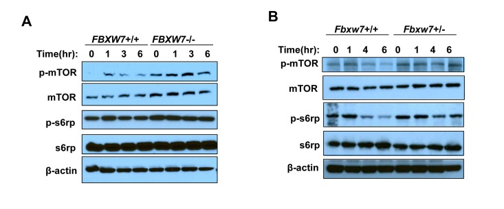Figure 1.Radiation inhibits mTOR and its signaling in a FBXW7-depentend manner. mTOR and its signaling was assessed by Western blot assays with antibodies to p-mTOR (Ser2448), mTOR, p-S6rp (Ser240 and Ser244), S6rp, and β-Actin. (A) Detection of mTOR and its downstream signaling in HCT116 wild type and FBXW7−/− cells at different time points after single dose of 4Gy X-ray radiation. (B) Detection of mTOR and its downstream signaling in thymuses from wild type and FBXW7+/− mice that were collected at different time points after single dose of 4Gy X-ray radiation.
