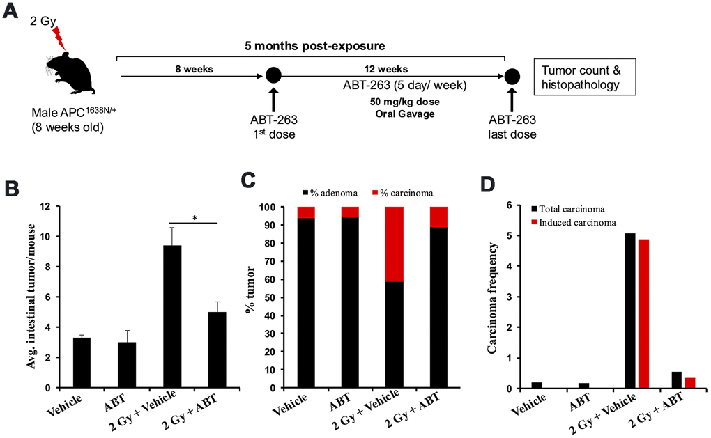 Figure 2.ABT-263 mitigates γ-induced intestinal tumor development in male Apc1638N/+ mice. (A) Experimental plan of ABT-263 testing as a mitigator for γ-induced intestinal carcinogenesis. (B) Intestinal-tumorigenesis at 150 days post-exposure in vehicle (n=10), ABT-263 only (n=5), 2 Gy + vehicle (n=6), and 2 Gy + ABT-263 (n=6) groups. Data presented as mean ± SEM, and * p<0.05, relative to control animals. (C) Quantification of adenoma and carcinoma percentage. For each group, the percentages of adenomas and carcinomas relative to the total number of tumors assessed were calculated. (D) Effect of ABT-263 on spontaneous and IR-induced carcinoma frequency. Carcinoma frequency was defined as the number of carcinomas divided by the total tumors assessed. The induced carcinoma frequency was obtained by subtracting the spontaneous carcinoma frequency (from the control group) from that of the irradiated groups.