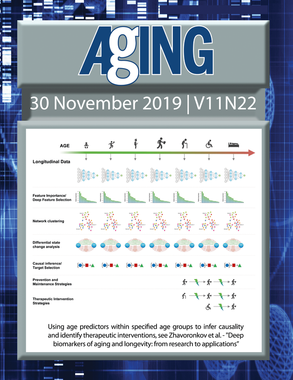 The cover features Figure 4 "Using age predictors within specified age groups to infer causality and identify therapeutic interventions" from Zhavoronkov et al.