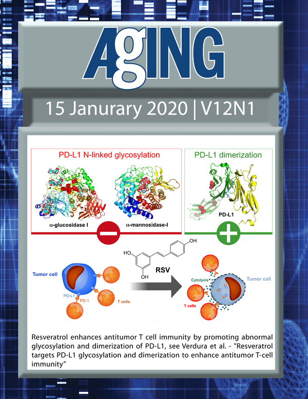 The cover features Figure 9 "Resveratrol enhances antitumor T cell immunity by promoting abnormal glycosylation and dimerization of PD-L1. “ from Verdura et al.