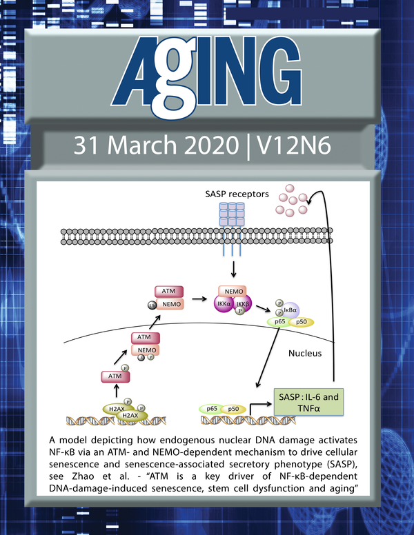The cover features Figure 8 "A model depicting how endogenous nuclear DNA damage activates NF-κB via an ATM- and NEMO-dependent mechanism to drive cellular senescence and senescence-associated secretory phenotype (SASP)“ from Zhao et al.