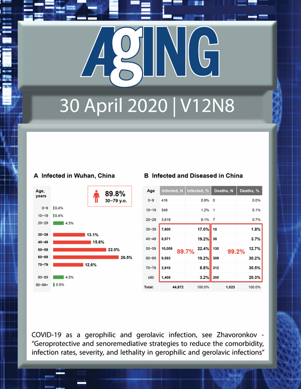 The cover features Figure 2 "COVID-19 as a gerophilic and gerolavic infection“ from Zhavoronkov
