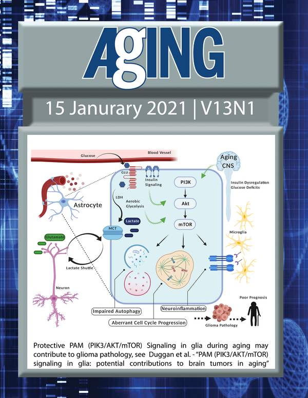 The cover features Figure 1 "PAM (PIK3/AKT/mTOR) signaling in glia during aging may contribute to glioma pathology“ from Duggan et al.