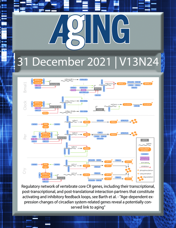 The cover features Figure 2 "Regulatory network of vertebrate core CR genes, including their transcriptional, post-transcriptional, and post-translational interaction partners that constitute activating and inhibitory feedback loops" from Barth et al.