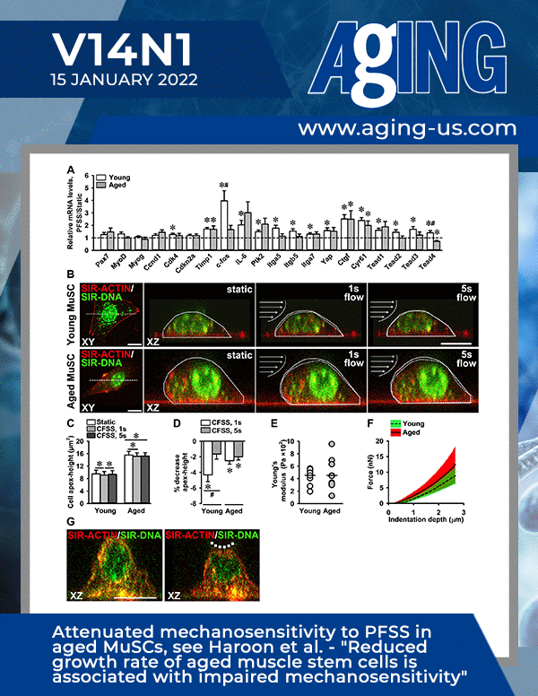 The cover features Figure 7 "Attenuated mechanosensitivity to PFSS in aged MuSCs" from Haroon et al.