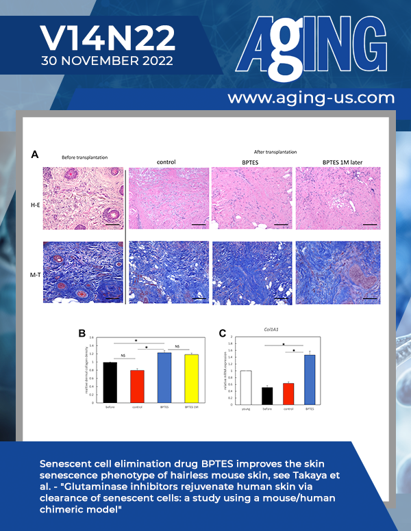 The cover features Figure 6 "Senescent cell elimination drug BPTES improves the skin senescence phenotype of transplanted aged human skin" from Takaya et al.