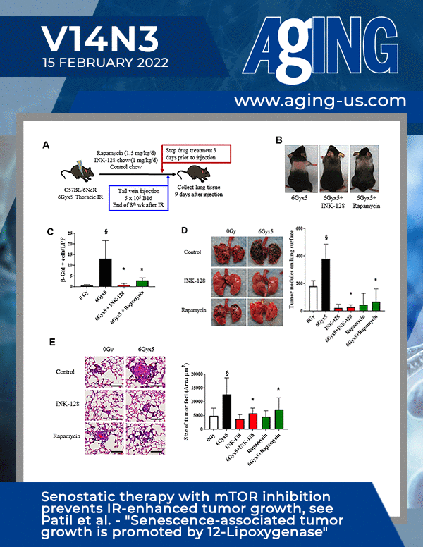 The cover features Figure 3 "Senostatic therapy with mTOR inhibition prevents IR-enhanced tumor growth" from Patil et al.