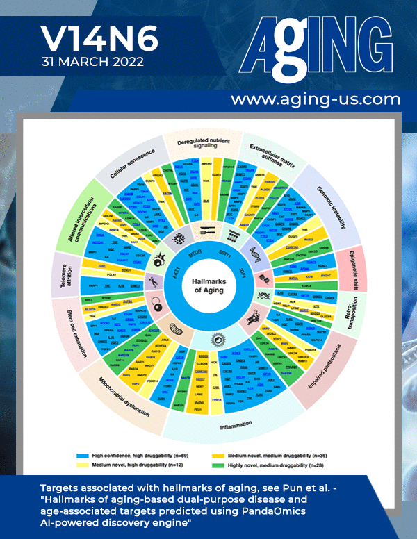 The cover features Figure 3 "Targets associated with hallmarks of aging" from Pun et al.