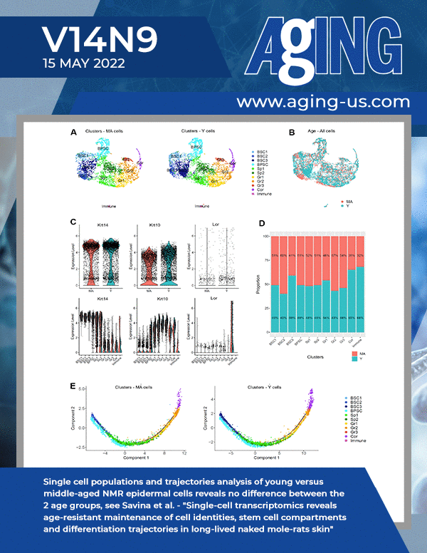 The cover features Figure 3 "Single cell populations and trajectories analysis of young versus middle-aged NMR epidermal cells reveals no difference between the 2 age groups" from Savina et al.