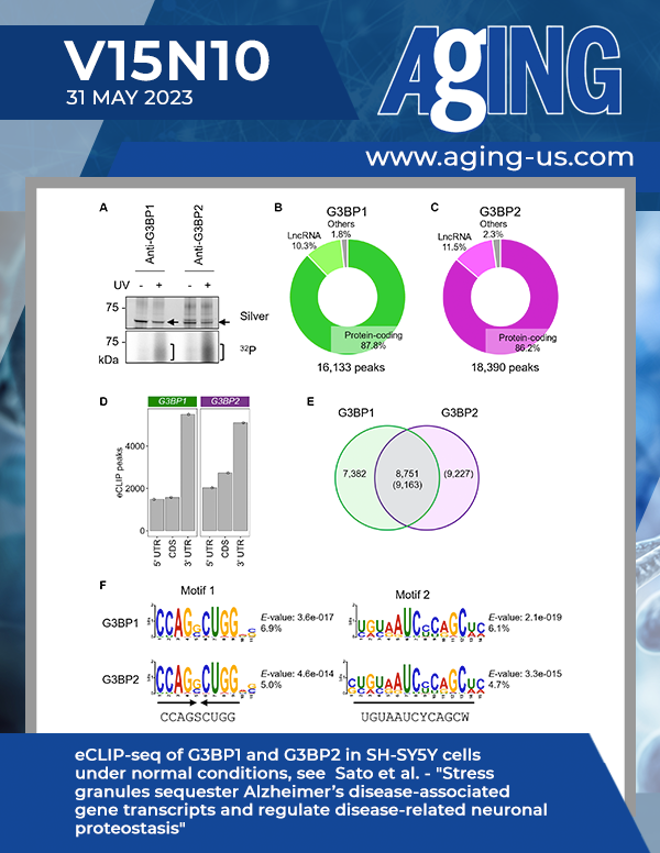 The cover features Figure 1 "eCLIP-seq of G3BP1 and G3BP2 in SH-SY5Y cells under normal conditions" from Sato et al.