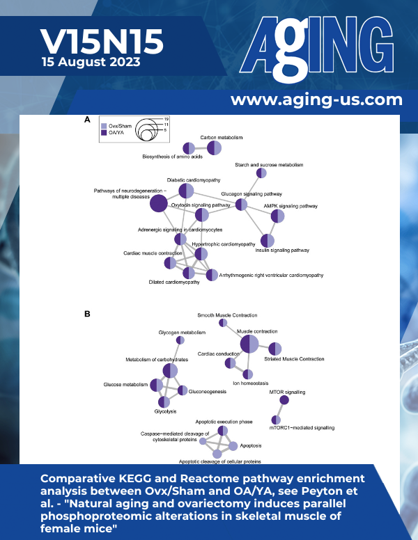 The cover features Figure 4 "Comparative KEGG and Reactome pathway enrichment analysis between Ovx/Sham and OA/YA" from Peyton et al.