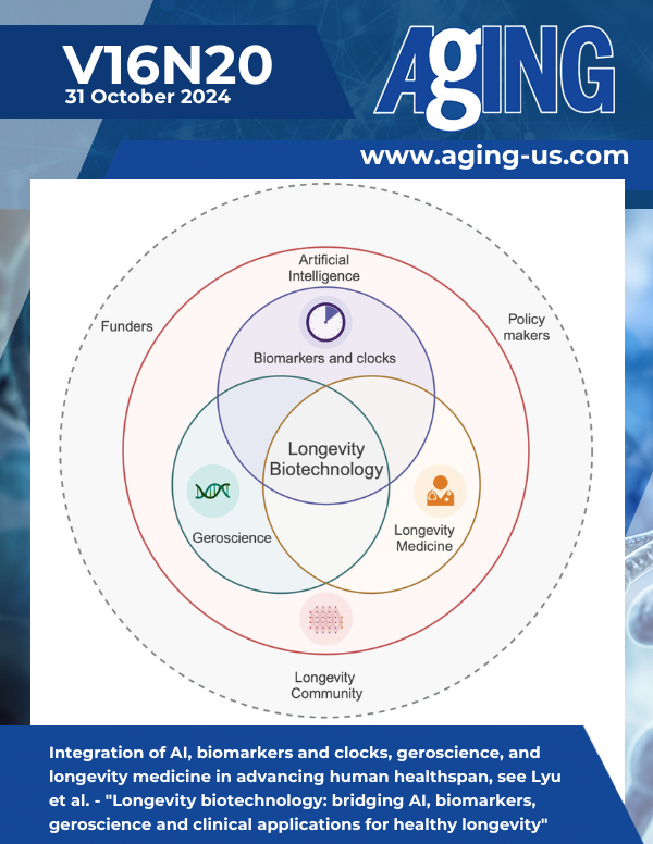 The cover features Figure 3 "Integration of AI, biomarkers and clocks, geroscience, and longevity medicine in advancing human healthspan" from Lyu et al.
