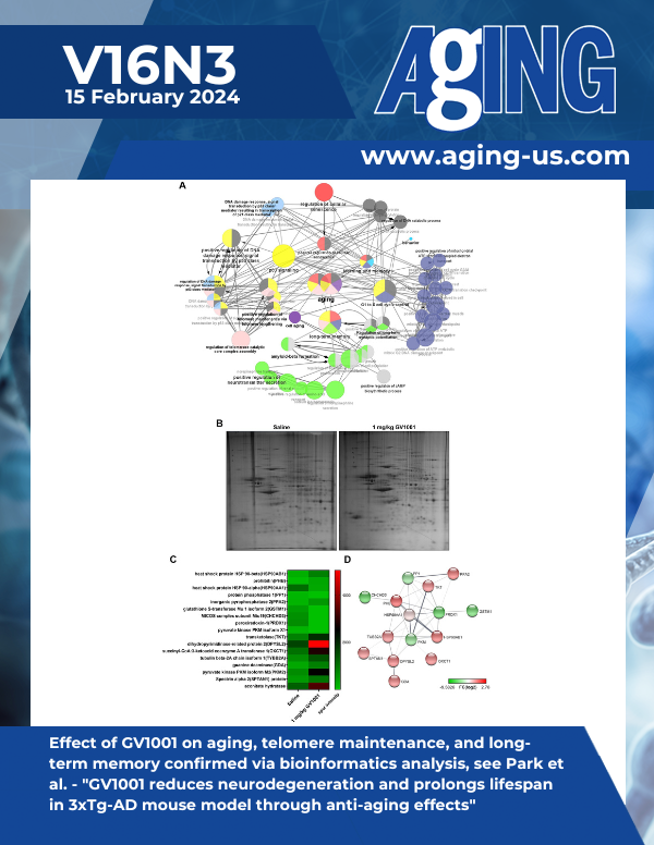 The cover features Figure 6 "Effect of GV1001 on aging, telomere maintenance, and long-term memory confirmed via bioinformatics analysis" from Park et al.