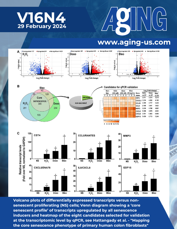 The cover features Figure 2 "Volcano plots of differentially expressed transcripts versus non-senescent proliferating (NS) cells; Venn diagram showing a ‘core senescent profile’ of transcripts upregulated by all senescence inducers and heatmap of the eight candidates selected for validation at the transcriptomic level by qPCR" from Hattangady et al.