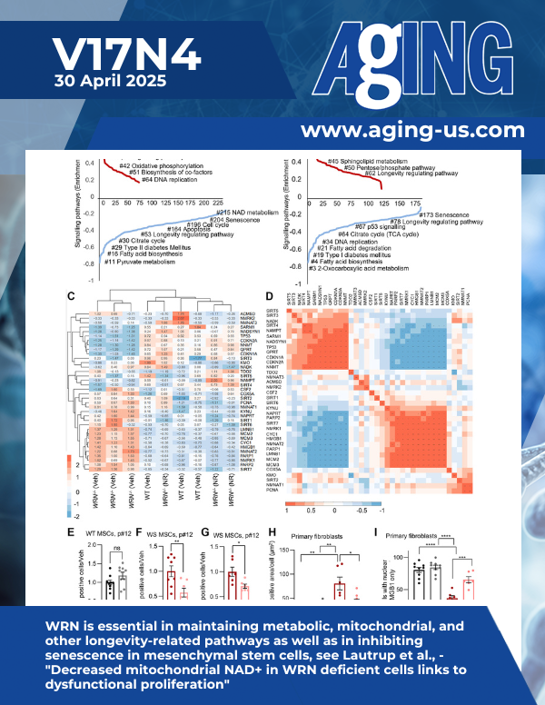 The cover features Figure 1 " WRN is essential in maintaining metabolic, mitochondrial, and other longevity-related pathways as well as in inhibiting senescence in mesenchymal stem cells" from Lautrup et al.