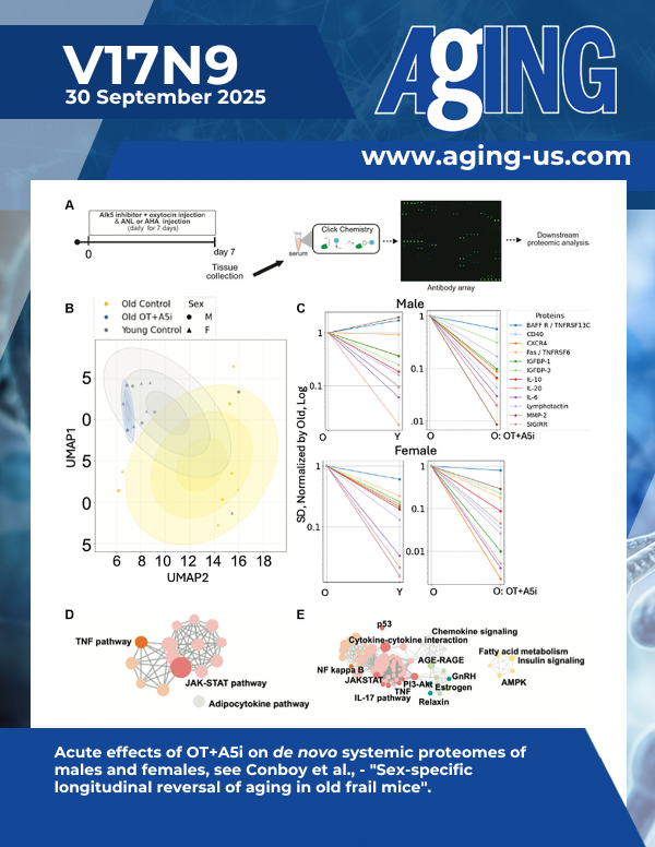 The cover features Figure 4 "Acute effects of OT+A5i on de novo systemic proteomes of males and females" from Conboy et al.