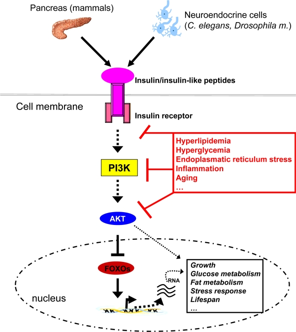 Figure 1. Insulin-like signalling plays a central role in growth, metabolism and the aging process. Insulin, derived from pancreatic beta-cells in mammals or insulin-like peptides derived from neuroendocrine cells in invertebrates signals via binding to and activation of the membrane bound receptors. This event subsequently activates PI3K, which through phosphorylation of membrane lipids (phosphorinositides) regulates activity of the downstream kinase AKT. AKT eventually phosphorylates forkhead transcript-tion factors such as FOXO1, which are then exported from the nucleus and degraded. FOXOs regulate transcription of many genes involved in glucose and lipid metabolism, growth, stress response and the aging process. Thus, insulin-like signalling is able to control all of these processes through FOXO regulation and other signalling cascades, in the end impinging on crucial physiological processes and lifespan itself. Nonetheless, chronic intake of energy-dense food coupled with little physical activity leads to hyperlipidemia and hyperglycemia, which through several mechanisms (including JNK1 activation) reduce cellular insulin sensitivity, thereby disrupting metabolic homeostasis.