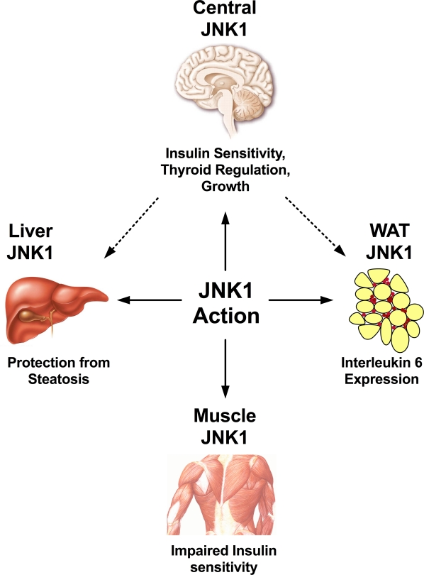 Figure 2. JNK1 represents a crucial regulator for a wide spectrum of physiological processes. In the white adipose tissue, JNK1 has been demonstrated to regulate expression of interleukin 6, which upon release into the circulation may act on the liver to decrease hepatic insulin sensitivity. Hepatic JNK1 action may downregulate insulin degradation, thus improving insulin half-life, and protecting from steatosis. JNK1 action in the skeletal muscle does impair local insulin sensitivity, although systemic glucose homeostasis is mostly unaffected. In the central nervous system, JNK1 is a negative regulator of insulin sensitivity, the thyroid axis and growth, although the exact neuron populations mediating these effects have not been defined yet.