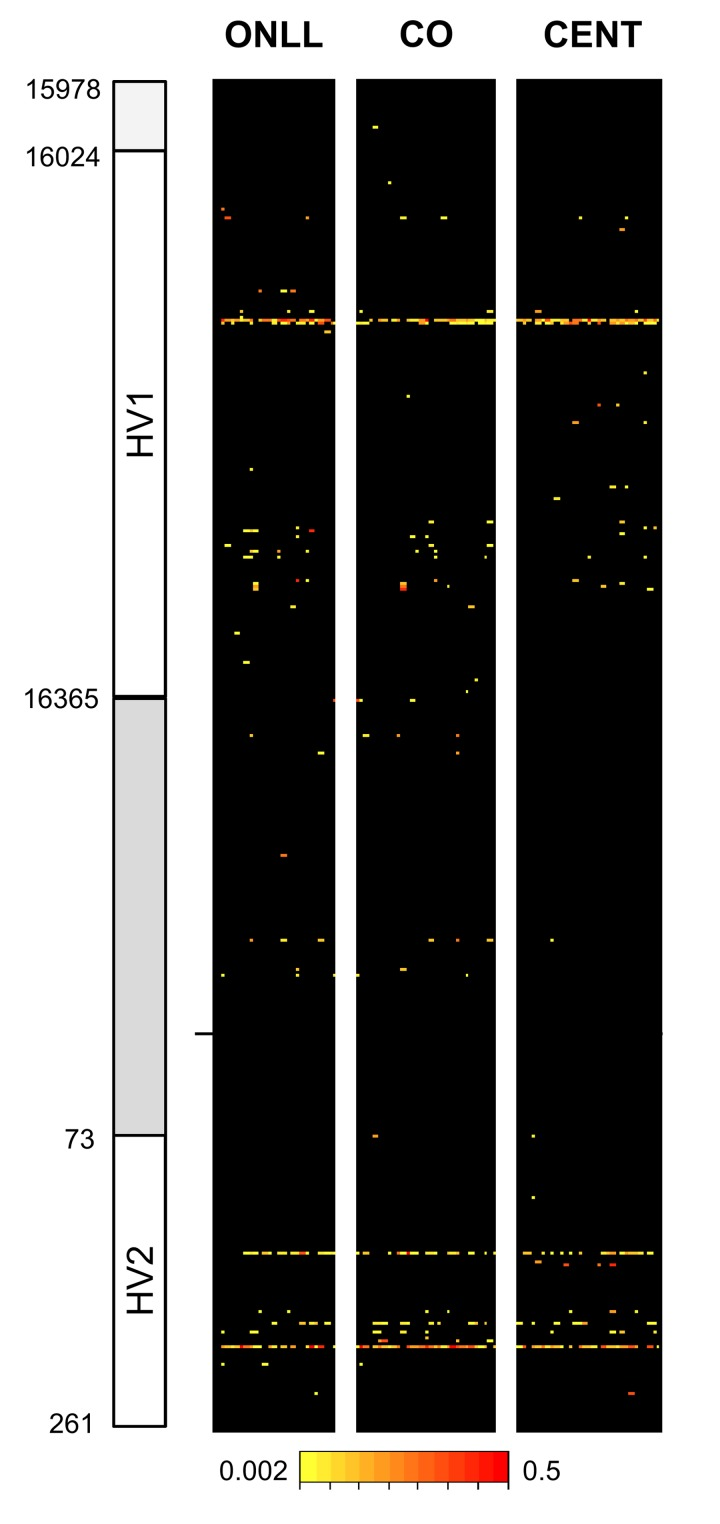 After quality control (see Methods) there were results for 30 CENT, 30 CO and 28 ONLL. Heteroplasmy was defined with a minimum threshold of 0.2%, resulting in 119 heteroplasmic positions in the 853 bp fragment analyzed (Figure 1). In particular, we identified 75 heteroplasmic sites in CENT, 101 in CO and 72 in ONLL. We then performed a Fisher-exact test to assess if HV1 (positions: form 15978 to 16364), the intermediate region (positions: from 16365 to 72) and HV2 (positions: from 73 to 261) have similar proportions of heteroplasmic sites. The test showed that HV1 and HV2 are enriched in heteroplasmic sites (OR = 1.25; CI 95% 1.10-1.43 and OR = 1.66; CI 95% 1.43-1.92 respectively) when compared to the intermediate region (OR = 0.24 CI 95% 0.18-0.32). Unsupervised hierarchical clustering was also performed to evaluate the distance between individuals (considering minor allele frequency); CENT, CO and ONLL individuals did not cluster according to group (Figure 1S).