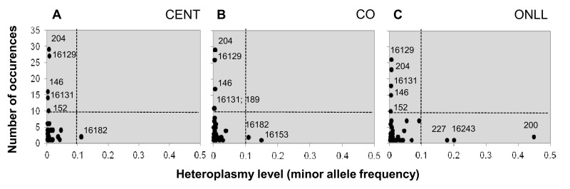 Figure 2. Heteroplasmic positions in the 3 groups Heteroplasmic positions plotted according to mean heteroplasmy level and number of occurrences in CENT (A), CO (B) and ONLL (C) respectively.