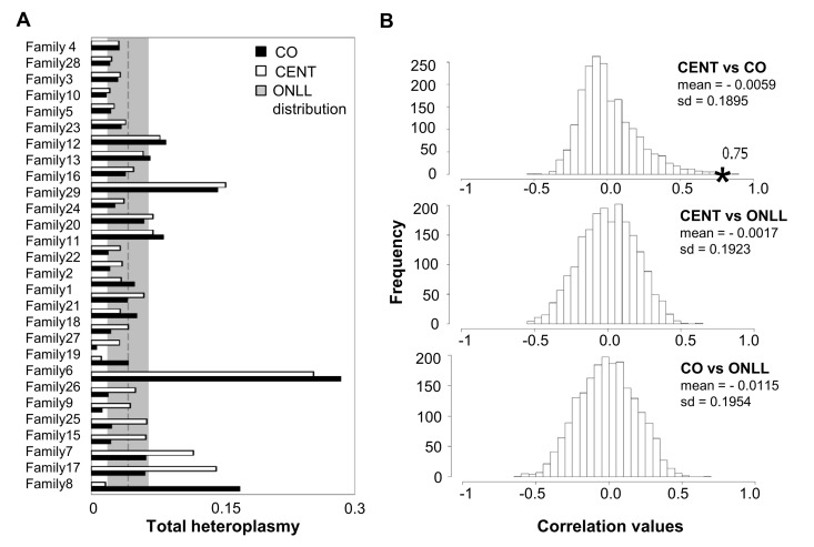 Figure 3. Total heteroplasmy in centenarians and their offspring and reshuffling analysis (A) Total heteroplasmy in centenarians and their offspring. White bars: centenarians; black bars: matched offspring. The dashed line and shading show the mean level and standard deviation of total heteroplasmy in ONLL. (B) Frequency distribution of correlation values based on 2000 reshufflings of total heteroplasmy values for CENT and unrelated CO, CENT and ONLL and CO and ONLL. Mean and standard deviation of the distribution is reported. The black star indicates the observed correlation value matching each centenarian with her own offspring.