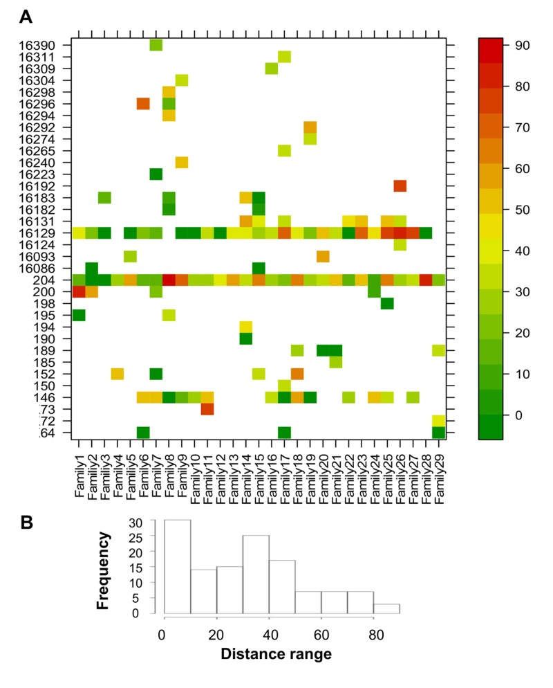 Figure 5. CENT and CO distances of positions that showed heteroplasmy in both individuals Distance values were calculated as the ratio between the absolute difference between CENT and CO MAF and the higher MAF value of the two (expressed as percentage). (A) Heteroplasmy distances plotted for each position and colored according to the scale bar on the right. (B) Frequency distribution of the distance values.
