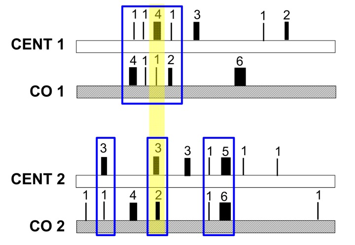 Figure 6. Model of the mechanism of heteroplasmic patterns in blood of long-lived families The number and thickness of each rectangle represents the different heteroplasmic level of each site, while the sum of all numbers represents the total heteroplasmy value. Total heteroplasmy is more similar within parents-offspring pairs than between pairs (CENT1 = 13 and CO1 = 14 while CENT2 = 17 and CO2 = 16). Each family shares a common core of heteroplasmic sites (here marked in blue). This core is composed of two types of heteroplasmic sites (i) public heteroplasmic positions that all pairs share (here marked with a yellow shadow) and (ii) private heteroplasmic sites that characterize each family.