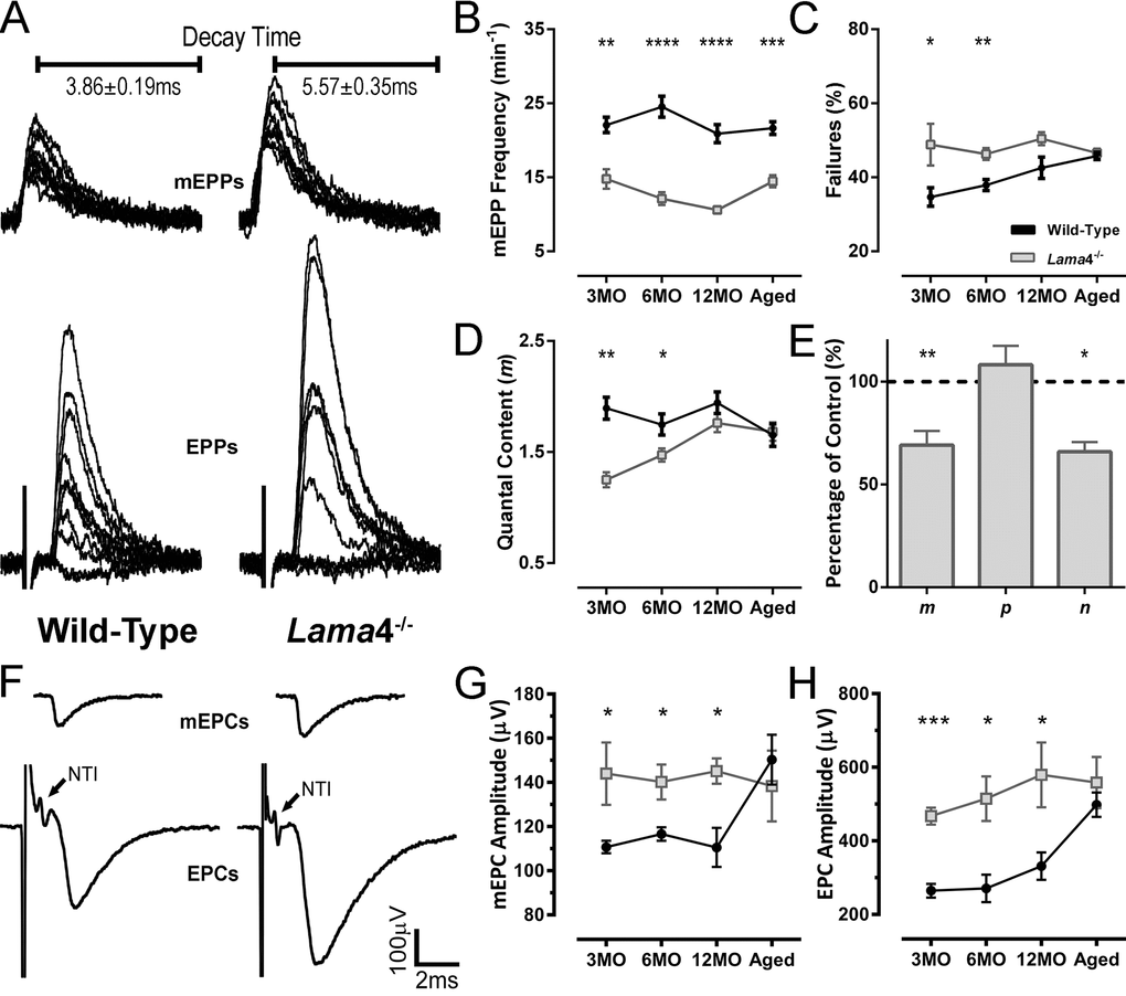 Figure 1. Altered transmission properties at lama4-/- neuromuscular junctions were maintained throughout adulthood to aging. (A) Sample traces from intracellular recordings of 10 consecutive mEPPs and 10 consecutive EPPs for WT and lama4-/- NMJs at 3MO in diaphragm muscle. Prolonged mEPP decay time was observed as indicated on sample traces. Stimulus artefacts have been omitted from EPP traces for clarity. (B) mEPPs frequency, (C) failures in evoked release and (D) quantal content were measured across all ages investigated. (E) Normalized binomial parameter analysis displayed decreased quantal content (m) at 3MO lama4-/- NMJs, which was resulted from lower number of active sites (n) with normal probability release of neurotransmitters (p). Binomial parameter analysis is normalized to 3MO WTs, as represented by dashed lines at 100%. (F) Sample traces from extracellular recordings of 10 averaged consecutive mEPCs and 10 averaged consecutive EPCs for WT and lama4-/- NMJs at 3MO. (G, H) amplitudes of (G) spontaneous release (mEPCs) and (H) evoked release (EPCs) across all age groups. For all graphs, n = 4-6, NMJs = 25-45 per genotype at each age. Statistical analyses were performed using Student’s t-test; values are presented as mean ± SEM (* P < 0.05, ** P < 0.01, *** P < 0.001 and **** P < 0.0001).