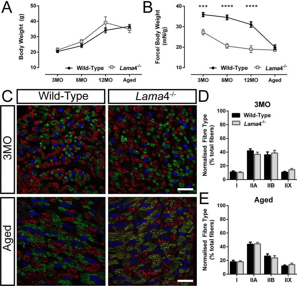 Figure 3. Weaker hind-limb grip force but normal distribution of different fiber types in lama4-/-. (A) Body weight of animals and (B) normalized grip force over body weight. Aged WT dropped in grip force/body weight tremendously and reached the similar level of motor performance to that of lama4-/-. (C) Triple labelling staining for different fiber types at 3MO and aged group; blue staining represents Type I, green represents Type IIA, red represents Type IIB and unstained fibers represents Type IIX in gastrocnemius muscle. Scale bar = 100 μm. (D, E) Distribution of each different fiber types at both ages of 3MO and aged was normal in both genotypes. (A-B), n = 8 for each genotype per age group investigated. (D-E), n = 5 for each genotype, with >1000 fibers counted for each genotype at 3MO and aged groups. Statistical analyses were performed using Student’s t-test; values are presented as mean ± SEM (*** P < 0.001 and **** P < 0.0001).