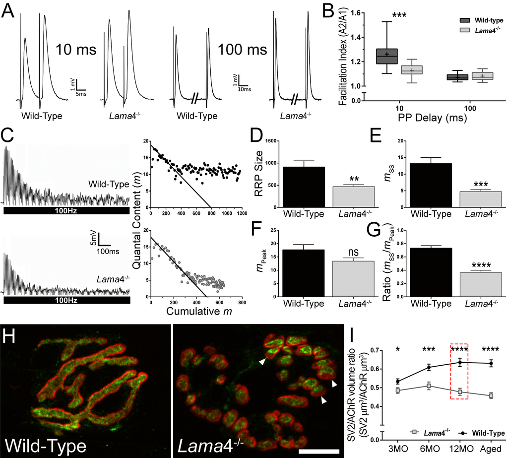 Figure 4. Lower facilitation and higher synaptic depression associated with decreased vesicle density at 12MO lama4-/- neuromuscular junctions in EDL muscle. (A) Sample traces of paired-pulse facilitation at 10 ms and 100 ms delay for 12MO WT and lama4-/- NMJs. (B) Plot of facilitation ratio against paired-pulse delay times at 10 ms and 100 ms. (C) Representative EPPs recordings during 100 Hz stimulation for 1 s duration at 12MO WT and lama4-/- NMJs. Estimation of RRP size was determined by plotting the y-axis (quantal content) over the x-axis (cumulative quantal content) and extrapolating the linear declining phase at x-axis. (D) RRP size, (E) quantal release during steady state plateau (mss), (F) quantal release during the first ten stimuli (mPeak) and (G) ratio of mss to mPeak measured between genotypes at 12MO. (H) Representative staining of synaptic vesicle 2 (SV2; green) with respect to postsynaptic AChRs endplate (red) at 12MO. Lama4-/- NMJ clearly displayed lower degree of overlap between SV2 and postsynaptic AChRs endplate (as indicated by arrow heads) which was not observed in WT NMJ. Scale bar = 10 µm. (I) SV2/AChR volume ratio was measured across all ages investigated. The difference in SV2/AChR volume ratio between both genotypes was evident at 12MO (as indicated in red dashed line box). (B) n = 4, NMJs = 13-15 per genotype. (D-G), n = 4, NMJs = 12 for both genotypes. (I) n = 3, NMJs = 51-82 per genotype at each age group. Statistical analyses were performed using Student’s t-tests for (B, D-G, and I); values are presented as mean ± SEM (* P < 0.05, ** P < 0.01, *** P < 0.001, and ****P < 0.0001).