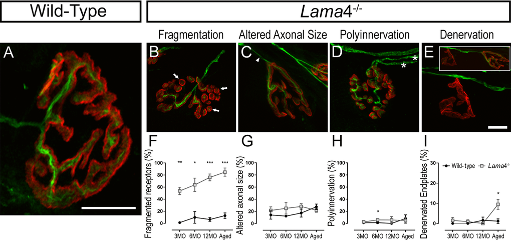 Figure 5. Accelerated aging features at lama4-/- neuromuscular junctions in EDL muscle. (A-E) Representative staining of axons and nerve terminal (green) in relation to the postsynaptic endplates (red) in WT (A) and lama4-/- (B-E) at 3MO. WT (A) showed normal innervation pattern while lama4-/- NMJs had (B) fragmented islands of postsynaptic receptors (as indicated by arrows), (C) altered innervating axonal size with thinning (as indicated by arrowhead) with some endplates displaying swollen axons, (D) polyinnervation or multiple axons entering the nerve terminal (as indicated with asterisks) and (E) completely denervated endplate with a smaller insert panel showing an occupied endplate alongside the denervated endplate. Scale bar = 10 µm. Quantification of aging features; (F) fragmented endplates, (G) altered axonal size, (H) polyinnervation and (I) denervated endplates across all ages. (F-I) n = 3, NMJs = 63-109 per genotype at each age group. Statistical analyses were performed using Student’s t-tests; values are presented as mean ± SEM (* P < 0.05, ** P < 0.01, and ***P < 0.001).