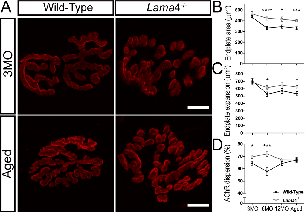 Figure 6. Larger postsynaptic endplates in area, expansion and dispersion of AChRs at lama4-/- neuromuscular junctions. (A) Representative staining of postsynaptic AChR endplates (red) in EDL muscle. WT and lama4-/- NMJs at 3MO had similar synapse area and endplate expansion. Aged lama4-/- NMJs maintained large synapse area and expansion similarly to 3MO whereas aged WT appeared smaller in area and expansion in comparison with both genotypes at 3MO and aged lama4-/- NMJs. Scale bar = 10 µm. Quantification of (B) synapse area, (C) endplate expansion and (D) dispersion of AChRs across all age groups. (B-D) n = 3, NMJs = 51-82 per genotype at each age group. Statistical analyses were performed using Student’s t-tests; values are presented as mean ± SEM (* P < 0.05, *** P < 0.001, and ****P < 0.0001).