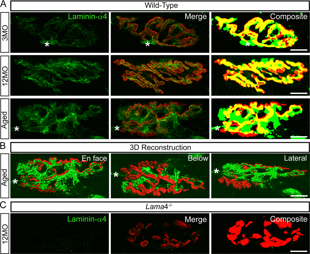 Figure 7. Altered expression of laminin-α4 at 12MO wild-type NMJs, becoming more evident at aged neuromuscular junctions. (A) Examples of representative staining of laminin-α4 chain (green) with respect to the postsynaptic endplates (red) in EDL muscle. Composite panel showed colocalization of laminin-α4 with postsynaptic endplate = yellow, extrasynaptic localization of laminin-α4 = green and missing laminin-α4 expression at postsynaptic region = red. Asterisk (*) is an indication of a nerve entering the nerve terminal, therefore it is not considered as an extrasynaptic localization of the laminin-α4 chain. WT at 3MO showed normal colocalization of laminin-α4 chain with respect to the postsynaptic endplates. By 12MO, WT began to display missing expression of laminin-α4 (observed with more red on composite panel) and mislocalized laminin-α4 expression (more green) compared with 3MO WT. As the NMJ aged, WT showed drastic changes in laminin-α4 expression with highly expressed laminin-α4 at the extrasynaptic region (high degree of green) and lacking laminin-α4 (high degree of red) compared with 12MO WT. The overlapping of laminin-α4 to postsynaptic endplates (yellow) at aged WT NMJ was at a much lesser degree in comparison with 12MO WT. (B) 3-dimensional (3D) reconstruction of laminin-α4 staining (green) in relation to postsynaptic endplate (red) of aged WT NMJ from (A), in three different planes of view; en face, below and lateral. En face view is reflective of the image shown in (A). Below and lateral views confirmed that non-colocalized laminin-α4 staining was purely expressed at the extrasynaptic basal lamina region, not by non-muscle cells. (C) Lama4-/- NMJs at 12MO displayed no expression of laminin-α4 chain. Scale bar = 10 µm.