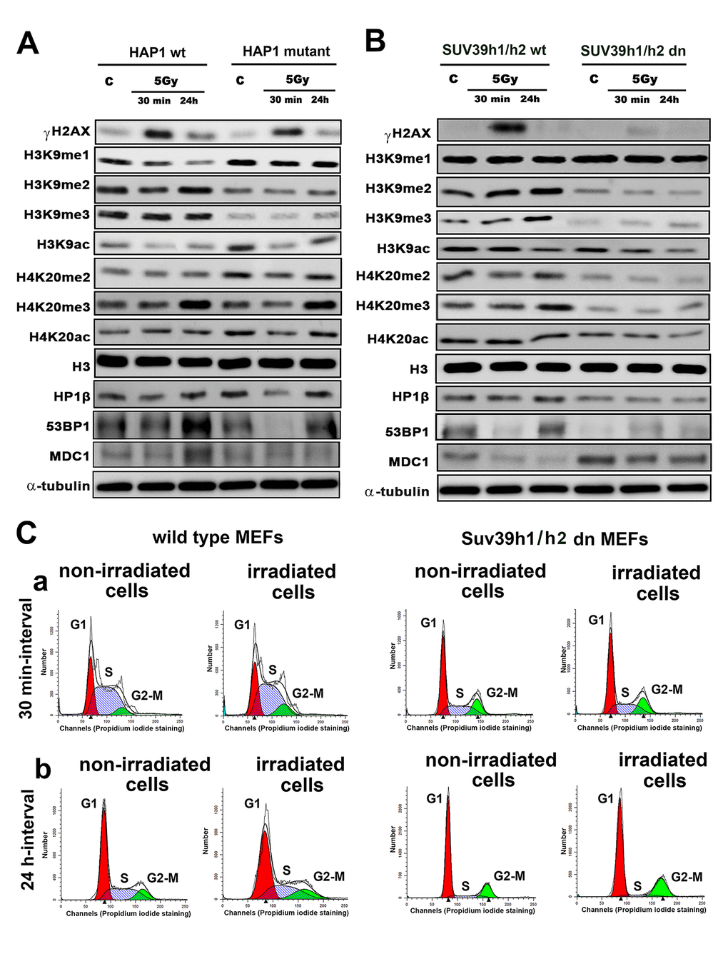 Figure 1. Histone signature in non-irradiated and irradiated cells without and with mutation or deletion in Suv39h1/h2 histone methyltransferases. Western blot analysis of γH2AX, H3K9me1, H3K9me2, H3K9me3, H3K9ac, H4K20me2, H4K20me3 and H4K20 acetylation. The levels of modified histones were normalized to that of total H3 histones. As DNA damage markers, 53BP1, MDC1 proteins, and the HP1β protein were studied and normalized to the level of α-tubulin. Protein levels were studied in (A) HAP1 wt and HAP1 cells with the mutation in the SUV39H1 gene and (B) in wt MEFs and Suv39h1/h2-deficient fibroblasts (MEFs). Non-irradiated cells and cells irradiated by 5 Gy of γ-rays (harvested 30 min and 24 hours after irradiation) were analyzed. (C) Cell cycle profiles were studied by flow cytometry in non-irradiated and γ-irradiated wt MEFs and non-irradiated and γ-irradiated Suv39h1/h2 dn mouse embryonic fibroblasts. Panel (a) shows a 30-min interval, and panel (b) shows a 24-h interval when the cells were harvested after irradiation (and related control samples). Using Mod-Fit software, the percentage of cells in G1 (red peak), S (dash blue peak) and G2-M (green peak) cell cycle phases was calculated. The average cell cycle profile is shown for individual samples, and experiments were performed in 3 biological replicates.