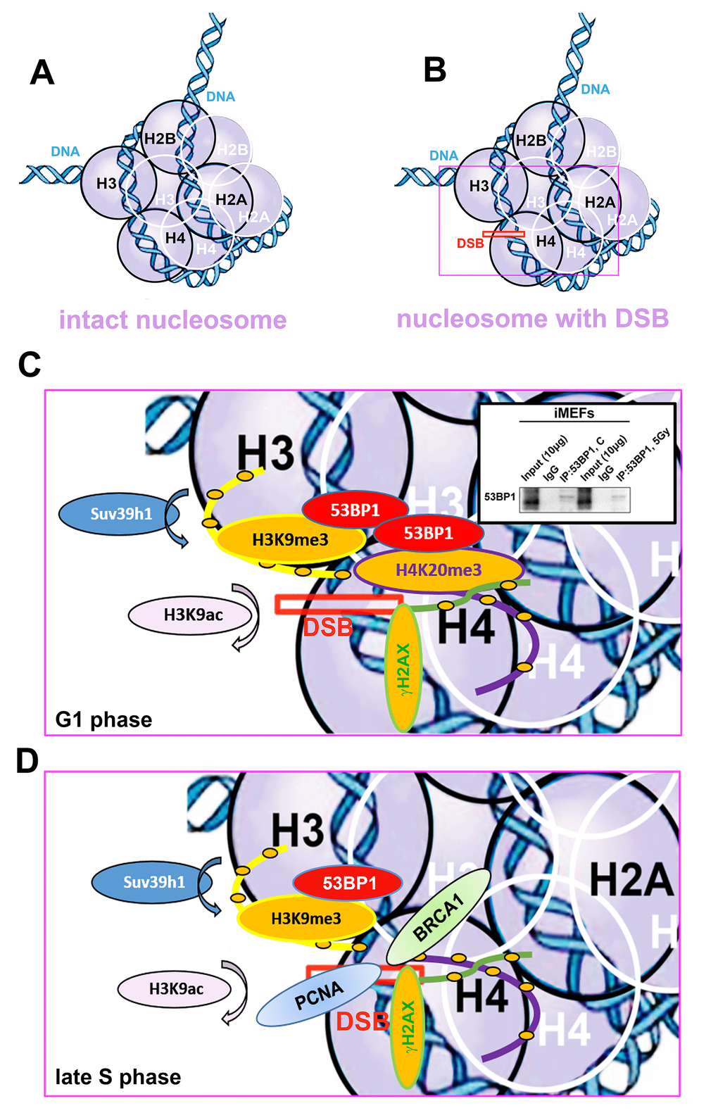 Figure 10. Schematic illustration of a nucleosome with DSB occupied by studied proteins of interest in G1 and late S phase of the cell cycle. (A) Schema of an intact nucleosome. (B) Nucleosome with wound DNA with DSB. (C) A pictorial illustration of histone signature and recruitment of the 53BP1 protein to DNA lesions in the G1 phase of the cell cycle. Immunoprecipitation result shows dimerization of 53BP1 protein. (D) An illustration of histone signature and recruitment of PCNA and BRCA1 proteins to DNA lesions in late S phase of the cell cycle. Panels represent a schematic illustration of the results.