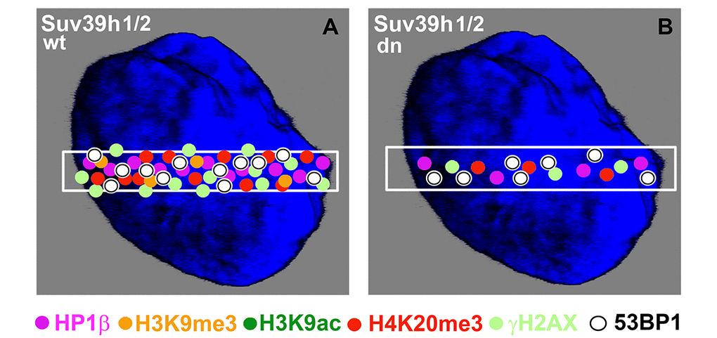 In recent years, it has been shown that histone modifications regulate gene expression and that these epigenetic processes are independent of changes in nucleotide sequences. Knowledge of epigenetic profiles is essential for an understanding of not only gene expression but also other cellular events, including regulation of the cell cycle, DNA repair, and apoptosis. Here, we studied the epigenetics of DNA repair and addressed the function of Suv39h1/h2 histone methyltransferases (HMTs) in the DNA damage response (DDR). In this regard, it is known that DNA lesions can occur spontaneously due to replication collisions or telomere dysfunction. In addition, DNA damage foci appear when the cells are exposed to radiation or DNA-damaging agents, and such DNA lesions can consist of double-strand breaks (DSBs) that are primarily deleterious to genome stability [1–3]. An injury in chromatin induces reorganization of the cell nucleus and causes local changes in the nuclear architecture. For example, chromosome territories (CTs) are rearranged and the local motion of promyelocytic leukemia (PML) bodies or Cajal bodies (CBs) is changed when the cells are exposed to radiation [4–7].