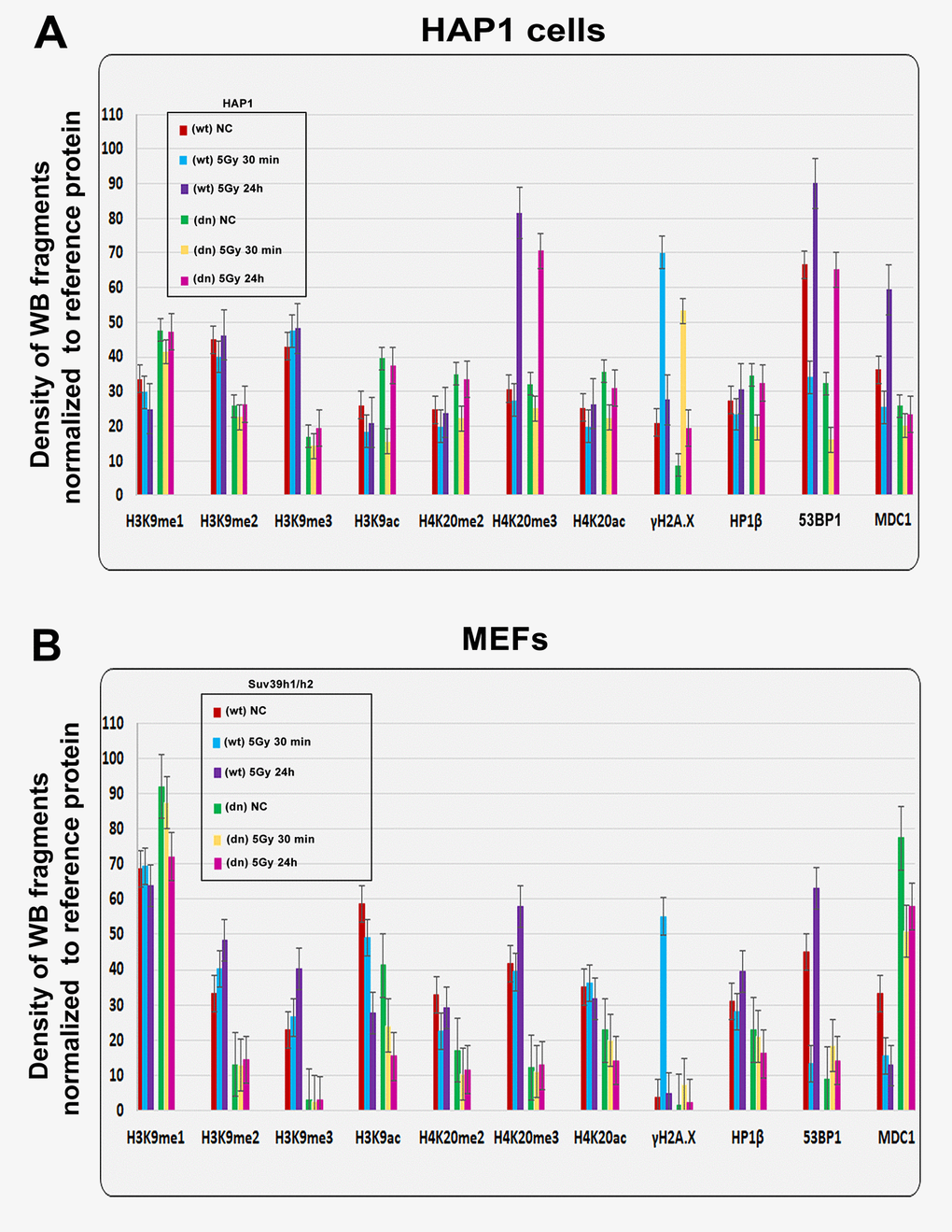 Figure 2. Quantification of western blot data on selected histone markers in non-irradiated and γ-irradiated cells. Using ImageJ and ImageQuant TL software, the levels of the following proteins (originated from Fig. 1A, B) were quantified: H3K9me1, H3K9me2, H3K9me3, H3K9ac, H4K20me2, H4K20me3, H4K20ac, γH2AX, HP1β, 53BP1, and MDC1. The levels of modified histones were normalized to those of total H3 histones, and those of DDR-related proteins were normalized to those of α-tubulin. Quantification was performed in the following samples: (A) HAP1 wt and HAP1 mutant cells and (B) wt MEFs and Suv39h1/h2-deficient fibroblasts (MEFs).