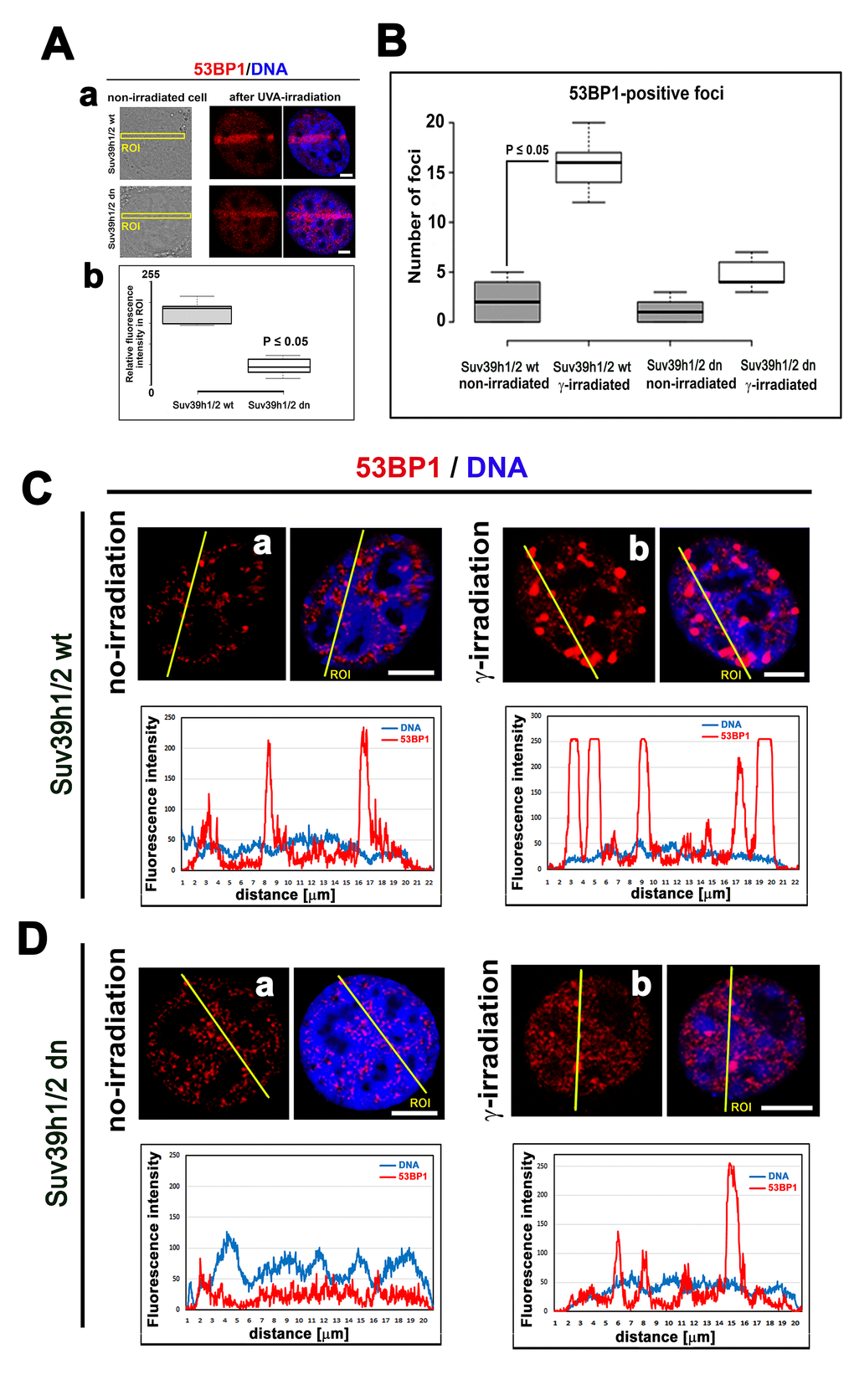 Figure 3. The nuclear distribution pattern of 53BP1 protein. (A) Recruitment of 53BP1 to locally micro-irradiated chromatin in (a) Suv39h1/h2 wt and (b) Suv39h1/h2 dn fibroblasts. Quantification using LAS AF software in panel (b) shows that the level of the 53BP1 protein at UVA-irradiated ROIs was reduced in Suv39h1/h2 dn MEFs. For statistical analysis, the Student’s t-test was used; the difference in the protein levels is statistically significant at P≤0.05. (B) An average number of 53BP1-positive foci was significantly increased in γ-irradiated Suv39h1/h2 wt MEFs compared with those in the non-irradiated wt counterpart. In Suv39h1/h2 dn MEFs, γ-irradiation did not significantly change a number of 53BP1-positive repair foci. Student’s t-test was used for statistical analysis, and statistical significance was defined as P≤0.05. The distribution of 53BP1 in (C) in (a) non-irradiated and (b) γ-irradiated wild-type MEFs and (D) (a) non-irradiated and (b) γ-irradiated Suv39h1/h2 dn MEFs. Scale bars represent 10 µm.