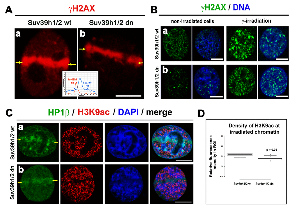 Figure 4. The level of γH2AX in irradiated chromatin. Recruitment of HP1β protein at γH2AX-positive DNA lesions and H3K9 deacetylation in UV-damaged chromatin. (A) Analysis of the level of γH2AX (red) in (a) Suv39h1/h2 wt and (b) Suv39h1/h2-deficient fibroblasts (MEFs). The appearance of γH2AX (red) was studied in micro-irradiated ROIs (see yellow arrows) induced by UVA laser (355 mm). (B) Levels of γH2AX (green) in non-irradiated and γ-irradiated (a) Suv39h1/h2 wt and (b) Suv39h1/h2 dn MEFs. Whole cell populations were irradiated by γ-rays. DAPI (blue) was used as a counterstain. Scale bars represent 10 µm. (C) Accumulation of HP1β (green) and the level of H3K9 deacetylation (red) in locally micro-irradiated (a) Suv39h1/h2 wt and (b) Suv39h1/h2 dn MEFs. DAPI was used as a counterstain of a whole nuclear volume. (D) Quantification of H3K9ac (red) in micro-irradiated chromatin showed an identical decrease of H3K9ac in micro-irradiated regions of interest (ROIs shown by yellow arrows in panels (Ca, b). Studies were performed in locally micro-irradiated Suv39h1/h2 wt and Suv39h1/h2 dn MEFs. Scale bars are 10 µm.