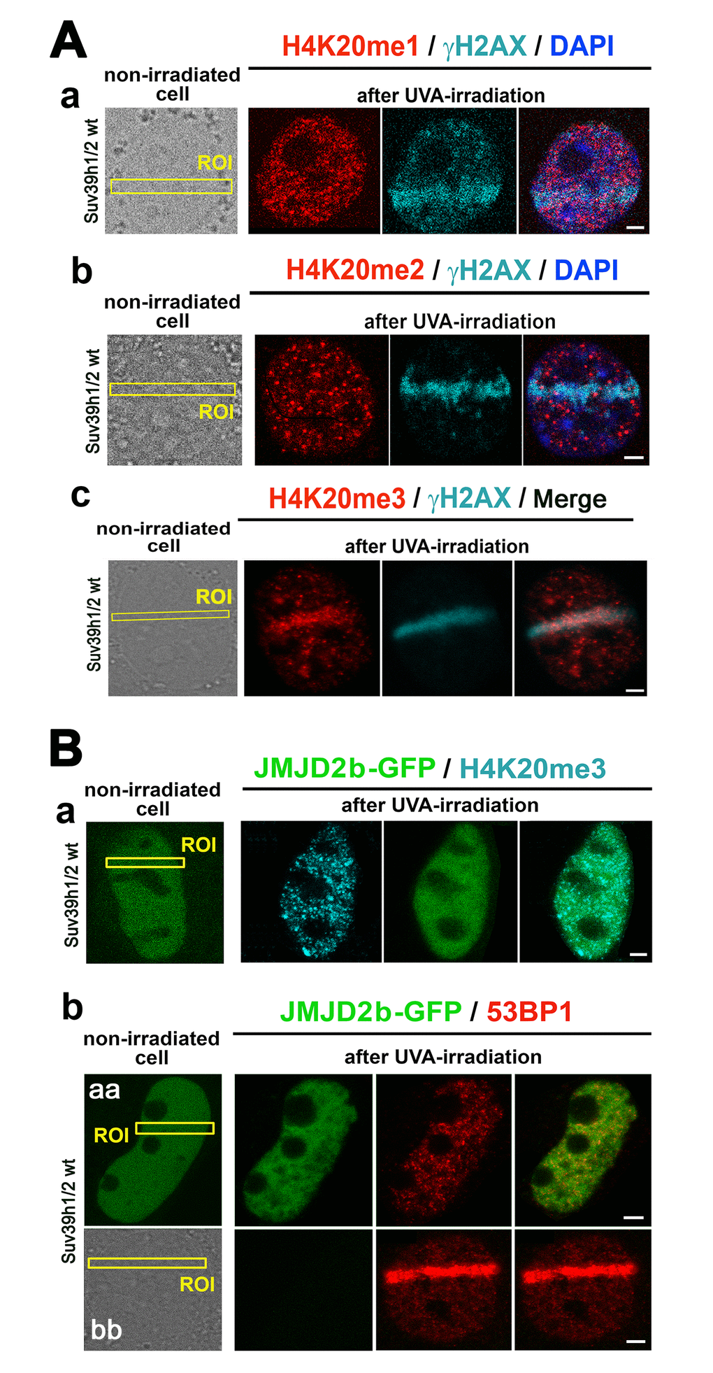 Figure 6. The nuclear distribution pattern of H4K20me1/me2/me3 at DNA lesions. (A) The levels of (a) H4K20me1 (red) in γH2AX-positive DNA lesions (magenta), (b) H4K20me2 (red) in γH2AX-positive DNA lesions (magenta), and (c) H4K20me3 (red) in DNA lesions studied in parallel with γH2AX (magenta). (B) The level of (a) H4K20me3 and (b) 53BP1 in micro-irradiated ROI of the cells over-expressing JMJD2b histone demethylase, tagged by GFP. Panels Bb-aa show low level of 53BP1 at micro-irradiation induced DNA lesions in cells over-expressing GFP-tagged JMJD2b and panel Bb-bb documents 53BP1 recruitment to DSB sites in the cells with a normal expression of JMJD2b. Scale bars in all panels represent 5 µm.