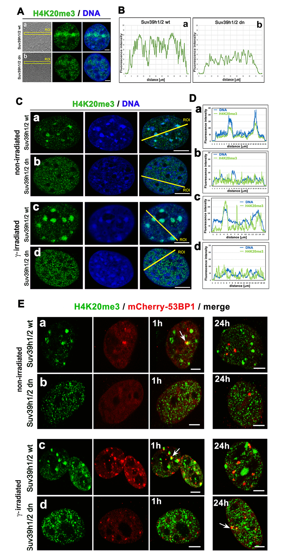 Figure 7. The nuclear distribution pattern of H4K20me3 (green) in UV-damaged chromatin. (Aa) Non-irradiated and γ-irradiated Suv39h1/h2 wt and (Ab) non-irradiated and γ-irradiated Suv39h1/h2 dn MEFs. DAPI (blue) was used as a counterstain. Scale bars represent 10 µm. (B) Quantification of H4K20me3 (green) shown in panels Aa, Ab. Quantification of H4K20me3 was performed according to the selected region of interests (ROIs, yellow lines). LAS AX software was used for analysis of fluorescence intensities. (C) Nuclear distribution pattern of H4K20me3 in (a) non-irradiated and (c) γ-irradiated Suv39h1/h2 wt and (b) non-irradiated and (d) γ-irradiated Suv39h1/h2 dn fibroblasts. (D) Quantification of fluorescence intensity of H4K20me3 is shown in panel Ca-d. Analysis by LAS AF software was performed in (a) non-irradiated and (c) γ-irradiated Suv39h1/h2 wt and (b) non-irradiated and (d) γ-irradiated Suv39h1/h2 dn MEFs. (E) Nuclear distribution of H4K20me3 (green) and the 53BP1 protein (red) in (a) non-irradiated and (c) γ-irradiated Suv39h1/h2 wt and (b) non-irradiated and (d) γ-irradiated Suv39h1/h2 dn cells.