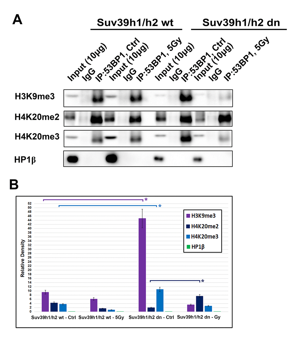 Figure 9. An interaction between 53BP1-H4K20me2/me3. (A) Immunoprecipitation (IP) experiments showed an interaction between H3K9me3 and 53BP1 or H4K20me2 and 53BP1 or H4K20me3 and the 53BP1 protein. HP1β protein did not interact with the 53BP1 protein. (B) Quantification of IP fragments from panel (A) studied in non-irradiated and γ-irradiated Suv39h1/h2 wt and Suv39h1/h2 dn cells. Asterisks (*) indicate statistical significance at P≤0.05.