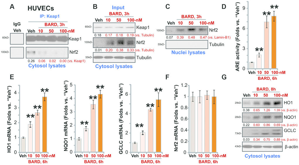 BARD can induce Nrf2 signaling cascade activation by releasing Nrf2 from Keap1 [21, 22]. A co-immunoprecipitation (Co-IP) assay was carried out in cultured HUVECs. Results, in Figure 1A, demonstrated that the cytosol Keap1-Nrf2 association was disrupted with treatment of BARD (10-100 nM) for 3h. The input control results demonstrated that Nrf2 protein levels were elevated in BARD-treated HUVECs (Figure 1B), where Keap1 levels were unchanged (Figure 1B). By testing the nuclear fraction proteins, we found that the Nrf2 protein was enriched in the nuclei of BARD (10-100 nM)-treated HUVECs, with significant increase of ARE activity (Figure 1D). Based on the results we propose that BARD treatment disrupted Nrf2-Keap1 binding, causing cytosol Nrf2 protein stabilization and nuclear translocation, thus increasing ARE activity in HUVECs.