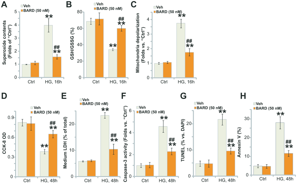 High glucose (HG) treatment in HUVECs can induce robust oxidative injury, responsible for following cell death and apoptosis [8, 28–31]. Contrarily, antioxidant agents or genetic strategies suppressing oxidative injury can protect HUVECs from HG [8, 28, 31]. We here also found that HG induced potent oxidative stress in HUVECs, leading to superoxide accumulation (Figure 2A), GSH reduction (a GSH/GSSG ratio decrease, Figure 2B) and significant mitochondrial depolarization (green JC-1 monomers accumulation, Figure 2C), which were largely attenuated by pretreatment of BARD (50 nM, 1h) (Figure 2A–2C).